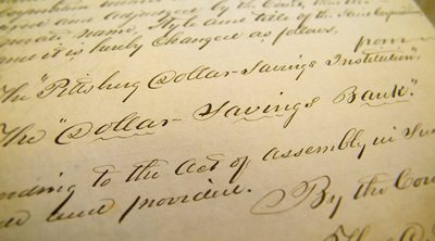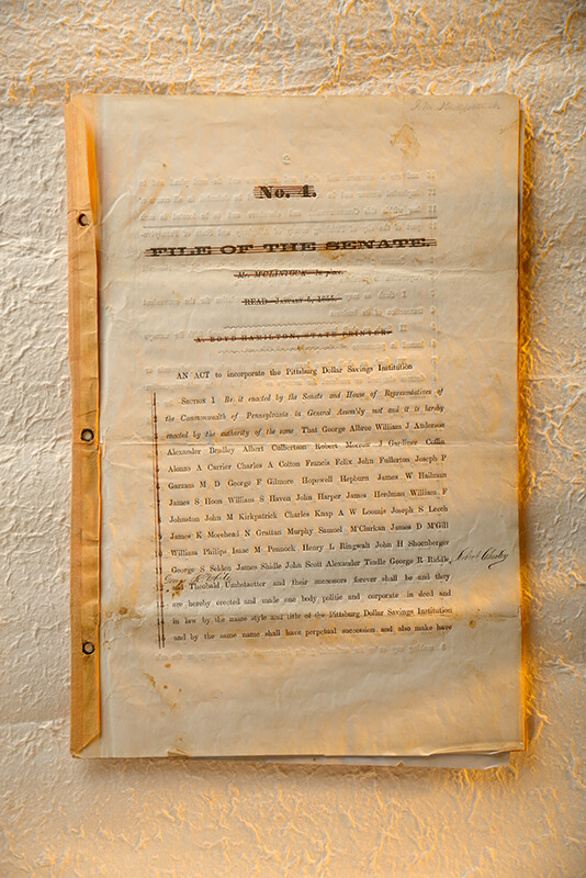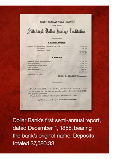 The bank started running newspaper ads under the title Dollar Savings Bank in June 1856. The Board of Trustees voted to approve the new name the following year. The name change, however, still had to be made official with Allegheny County.