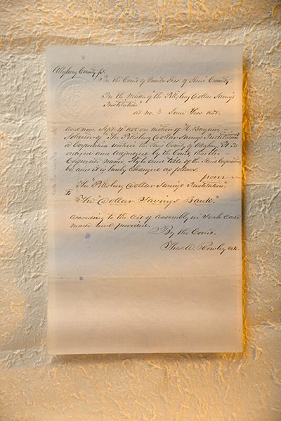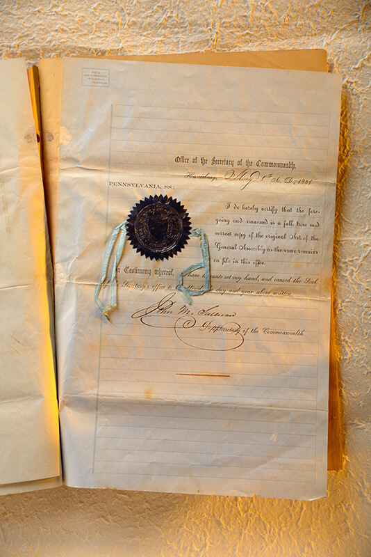 The bank was incorporated by a special act of the Pennsylvania Legislature on April 27, 1855. Deputy Secretary of the Commonwealth John M. Sullivan signed the charter on May 8th and affixed the official wax seal of the Commonwealth of Pennsylvania.