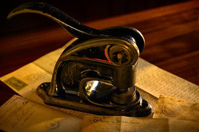 The bank purchased a cast iron hand-operated seal press to emboss the corporate seal on official bank documents. Dollar Bank's corporate seal remains a rich part of our heritage, and the vintage stamping press is one of the items preserved in the Dollar Bank Historical Collection.