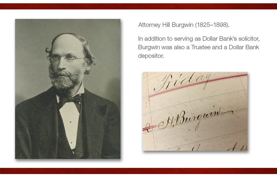 Dollar Bank's solicitor at the time, well-known Pittsburgh attorney Hill Burgwin, drew up the paperwork for the bank's name change and submitted the documents to the Allegheny County Court of Quarter Sessions in June 1858. The court approved the name change in September 1858.