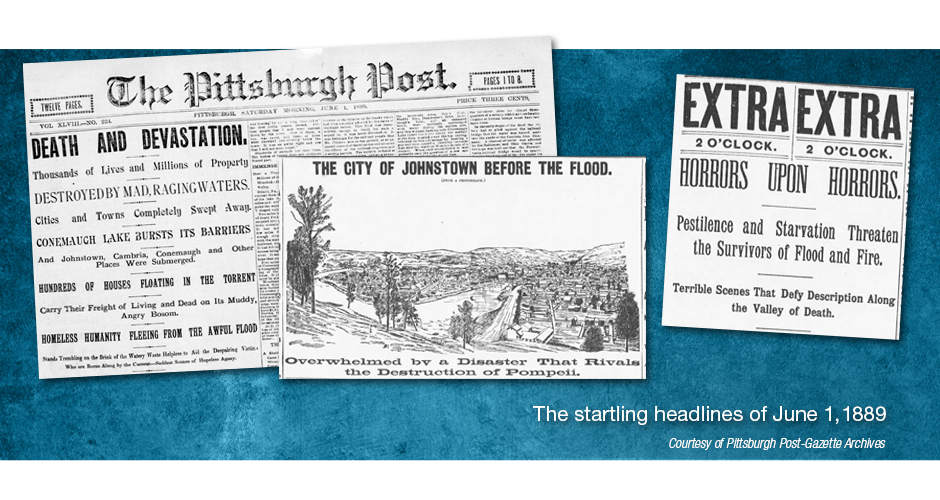 When Pittsburghers woke up on the morning of Saturday, June 1, 1889, they opened their newspapers and were confronted with reports of a terrible calamity less than a hundred miles away. The previous afternoon, the South Fork Dam in the Conemaugh Valley had suffered a catastrophic failure after 24 hours of heavy rainfall. More than 20 million tons of water were unleashed on communities below the dam. The torrent, which picked up debris and became an avalanche of everything, proceeded to smash the villages and towns of Mineral Point, East Conemaugh, Cambria City, Franklin and Woodvale.