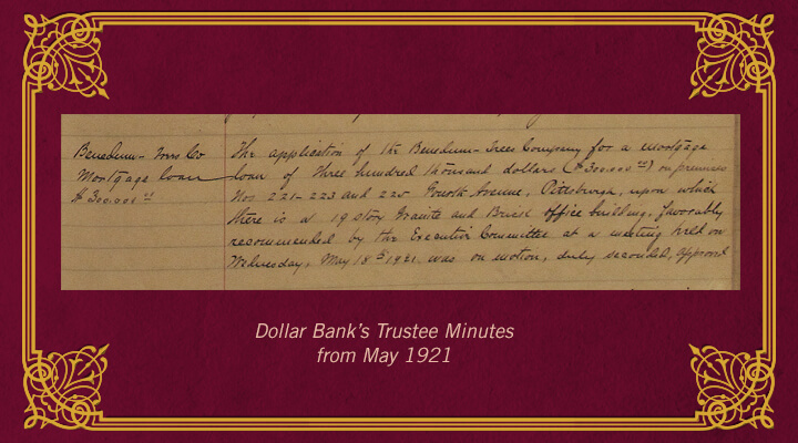 Among the mortgages issued by Dollar Bank in 1921 was a loan for $300,000 to the Benedum-Trees Oil Company on the company's headquarters building on Fourth Avenue.