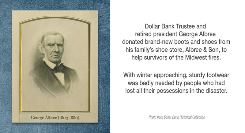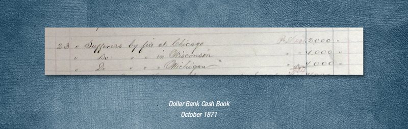 On October 23, 1871, Dollar Bank donated $4,000 to the Chicago and Northwestern Relief Fund -- $2,000 to the people of Chicago, and $1,000 each to the afflicted in Wisconsin and Michigan. This amount was the most given by any of the twenty-four Pittsburgh banks that contributed to the fund.