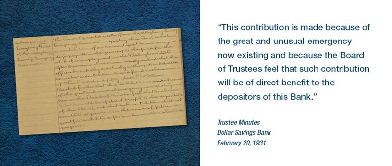 Dollar Bank's initial contribution to the job relief Emergency Fund, made in February 1931, was $350.00, representing one day's payroll from 1929. Subsequent contributions were more substantial and were based on a percentage of operating costs. During the years that the job relief program existed, 1931-1934, Dollar Bank contributed $20,193 to the fund. That's more than $400,000 in today's dollars.